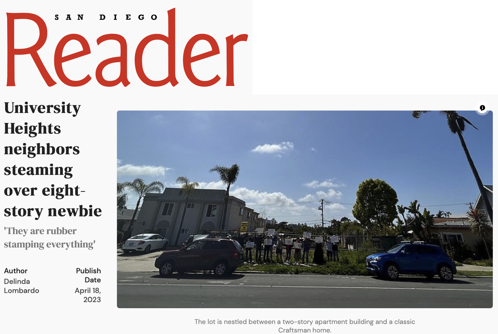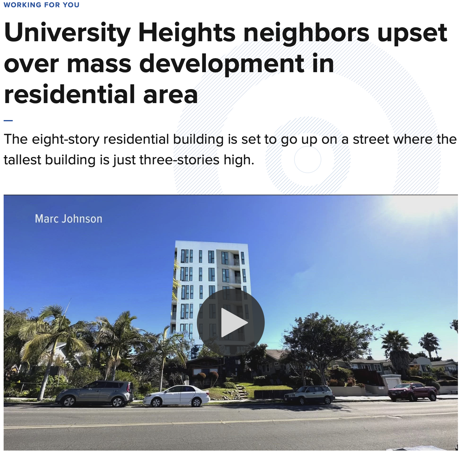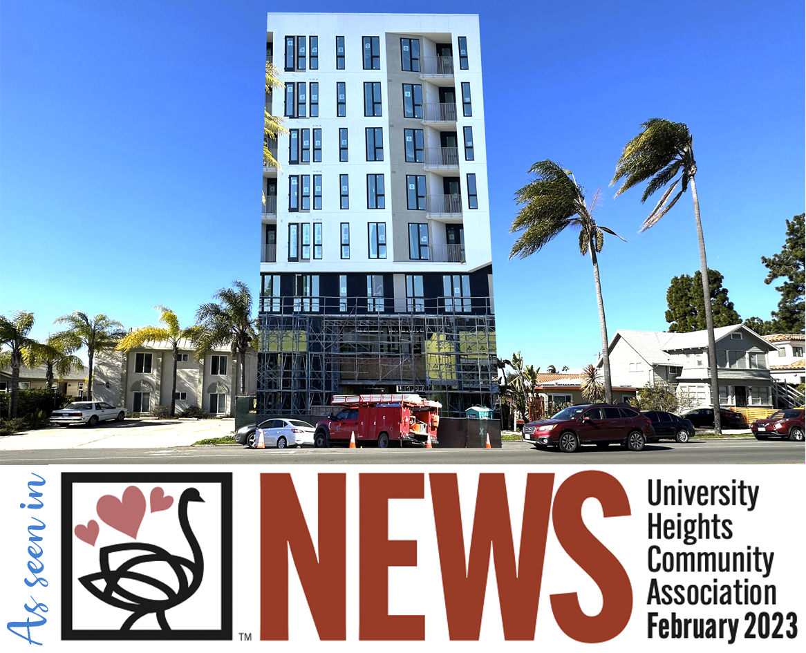The proposed 8-story, 49-unit building in the 4500 block of Cleveland Avenue in University Heights is an unfortunate example of a project allowed ministerially by the Complete Communities Program. The underlying zoning of the project is 15 to 29 dwelling units per acre and the parcel is about .175 acres. That means that only 2 deed-restricted affordable housing units will be required.