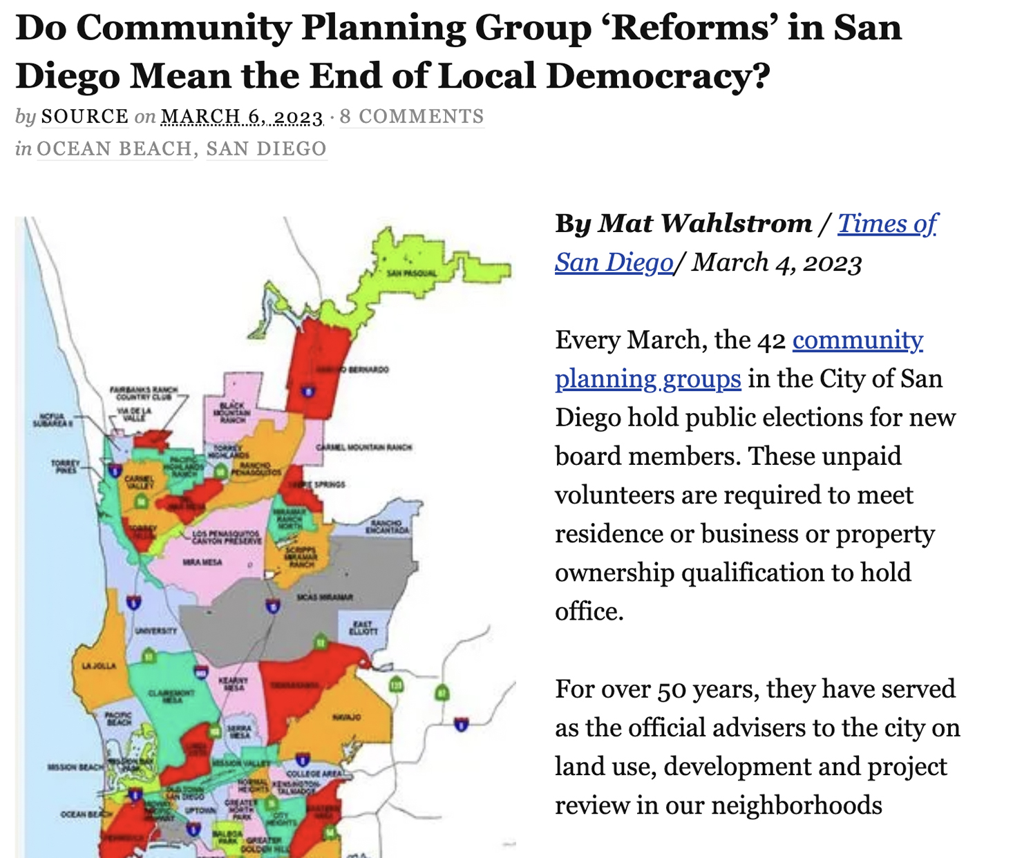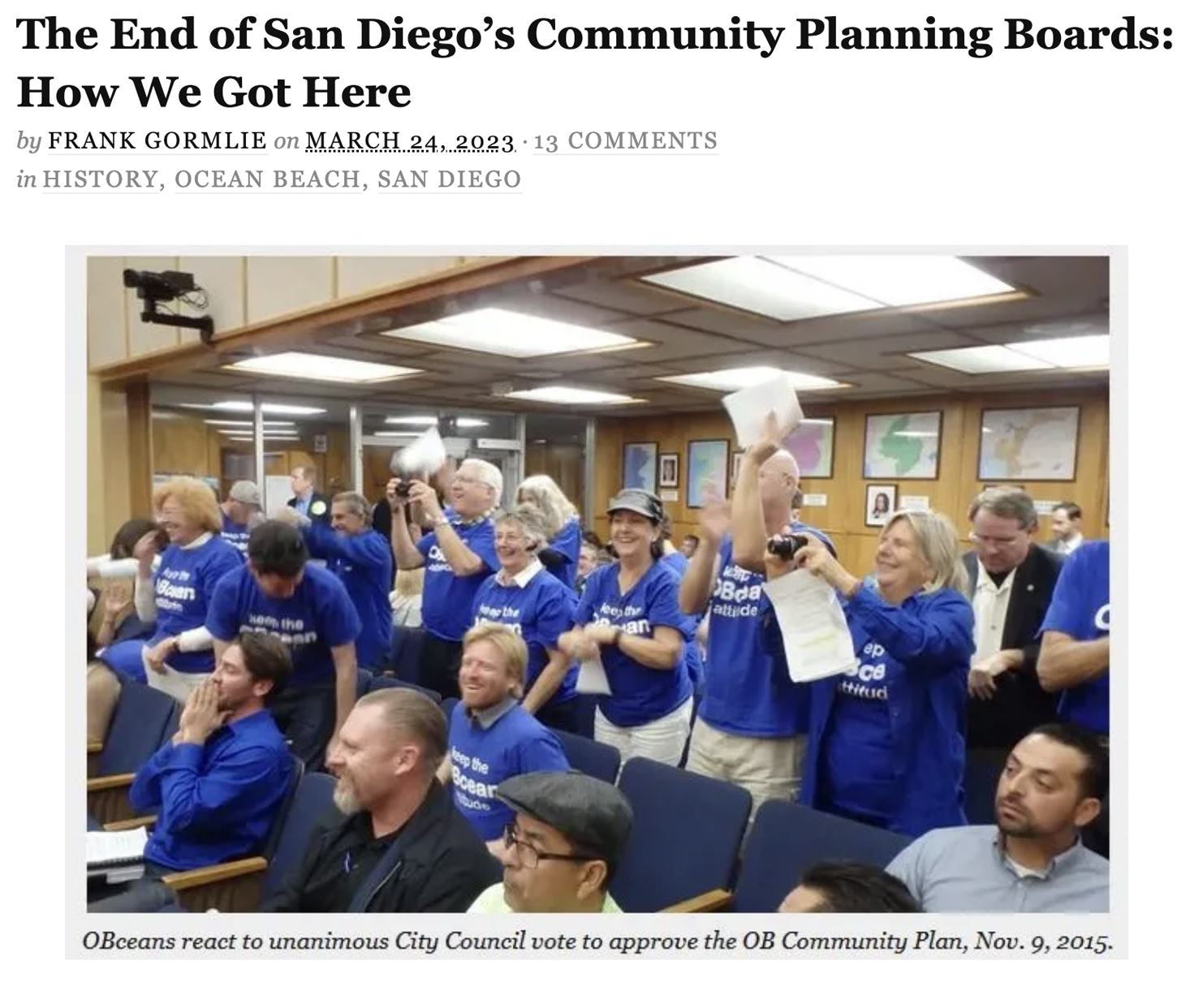 According to the City’s website, “There has been long-standing citizen involvement in planning in the City of San Diego. The City Council adopted policies in the 1960s and 1970s that established and recognized community planning groups as formal mechanisms for community input in the land use decision-making processes. Community planning groups (CPG) provide citizens with an opportunity for involvement in advising the City Council, the Planning Commission, and other decision-makers on development projects, general or community plan amendments, rezonings and public facilities. The recommendations of the planning groups are integral components of the planning process and are highly regarded by the City Council and by staff.”
